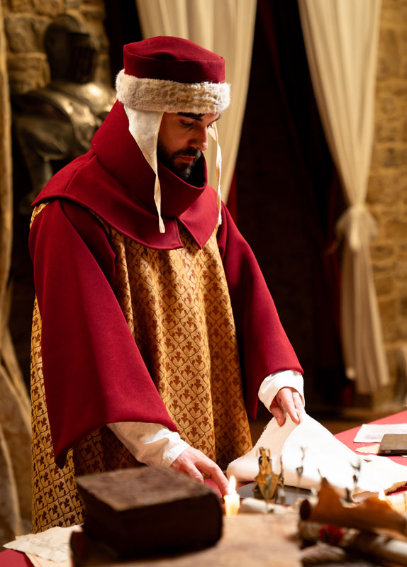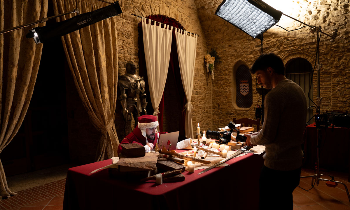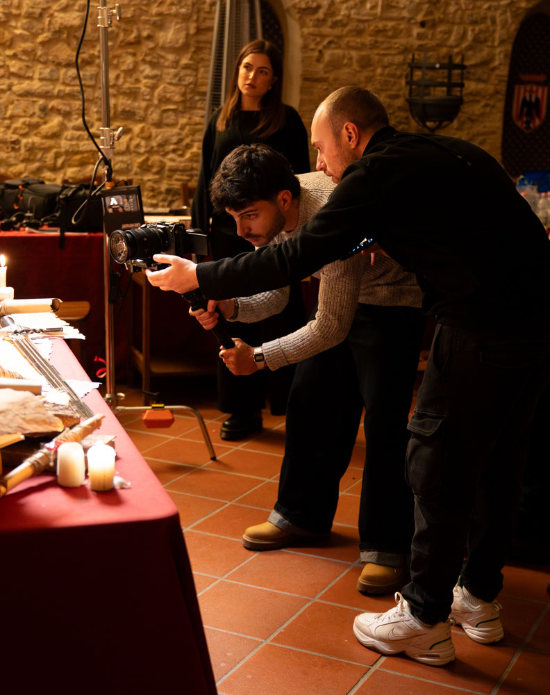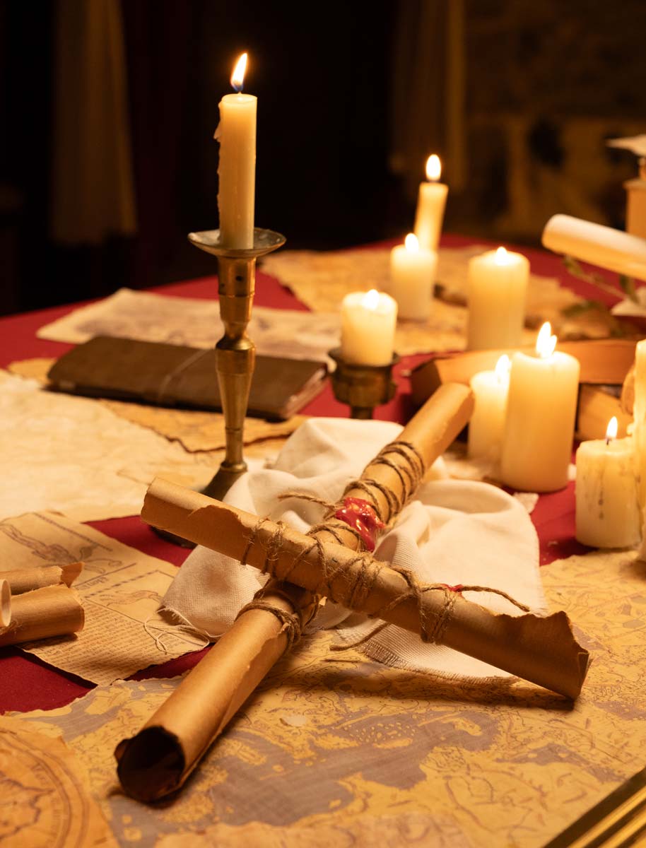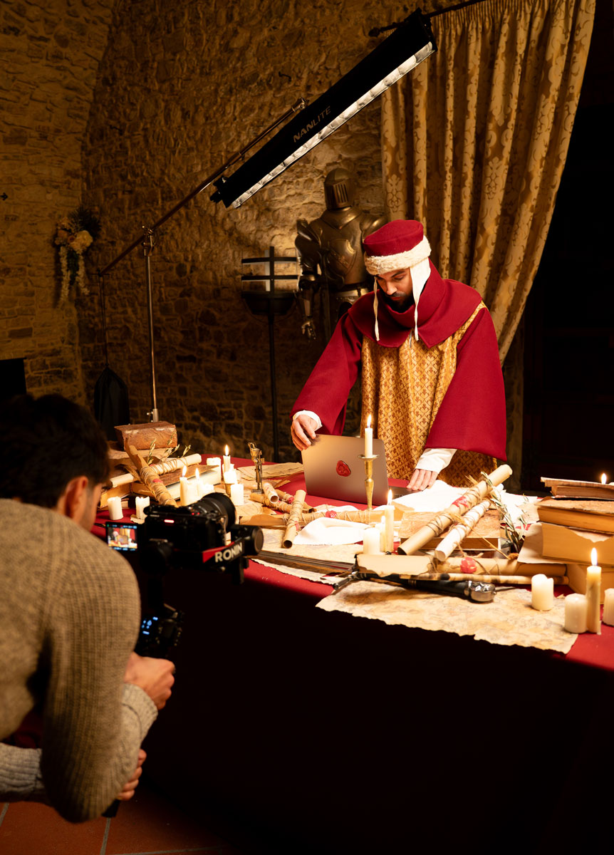 Ogni oggetto presente nell’ambiente medievale è selezionato per costruire un linguaggio coerente: pergamene, mappe, materiali naturali, texture del legno. La scenografia è stata curata nel minimo dettaglio e supportata da un esperto medievista per garantire autenticità rispetto all’epoca che vogliamo ricostruire.