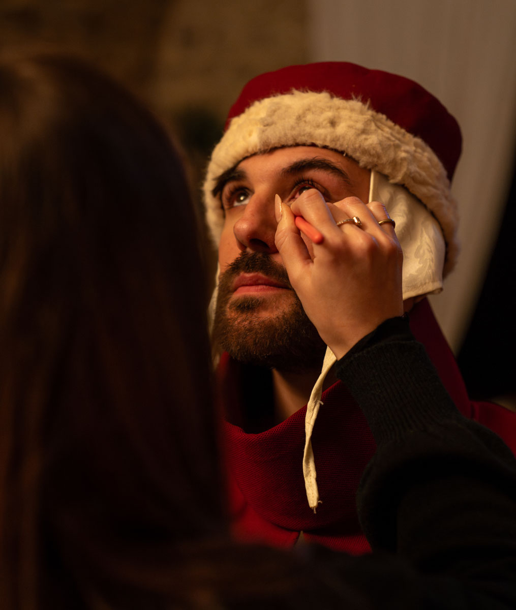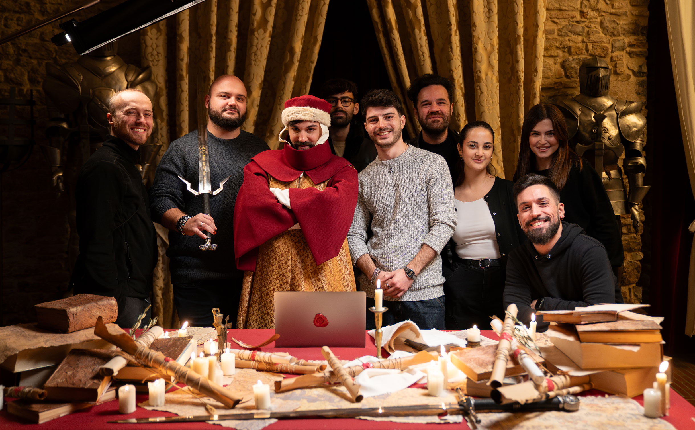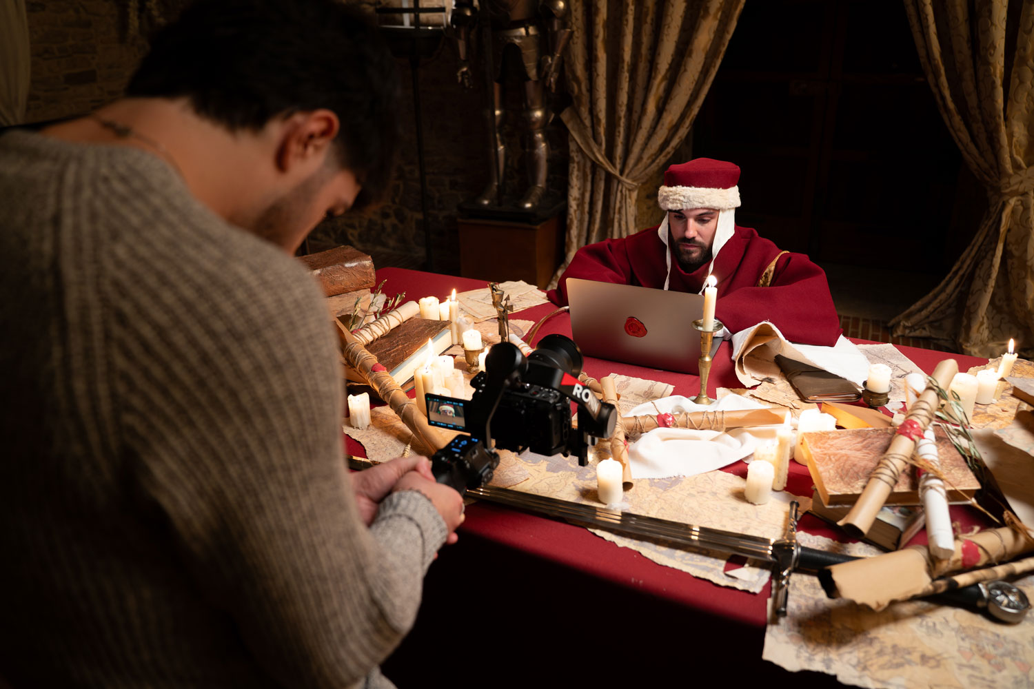 Ogni oggetto presente nell’ambiente medievale è selezionato per costruire un linguaggio coerente: pergamene, mappe, materiali naturali, texture del legno. La scenografia è stata curata nel minimo dettaglio e supportata da un esperto medievista per garantire autenticità rispetto all’epoca che vogliamo ricostruire.