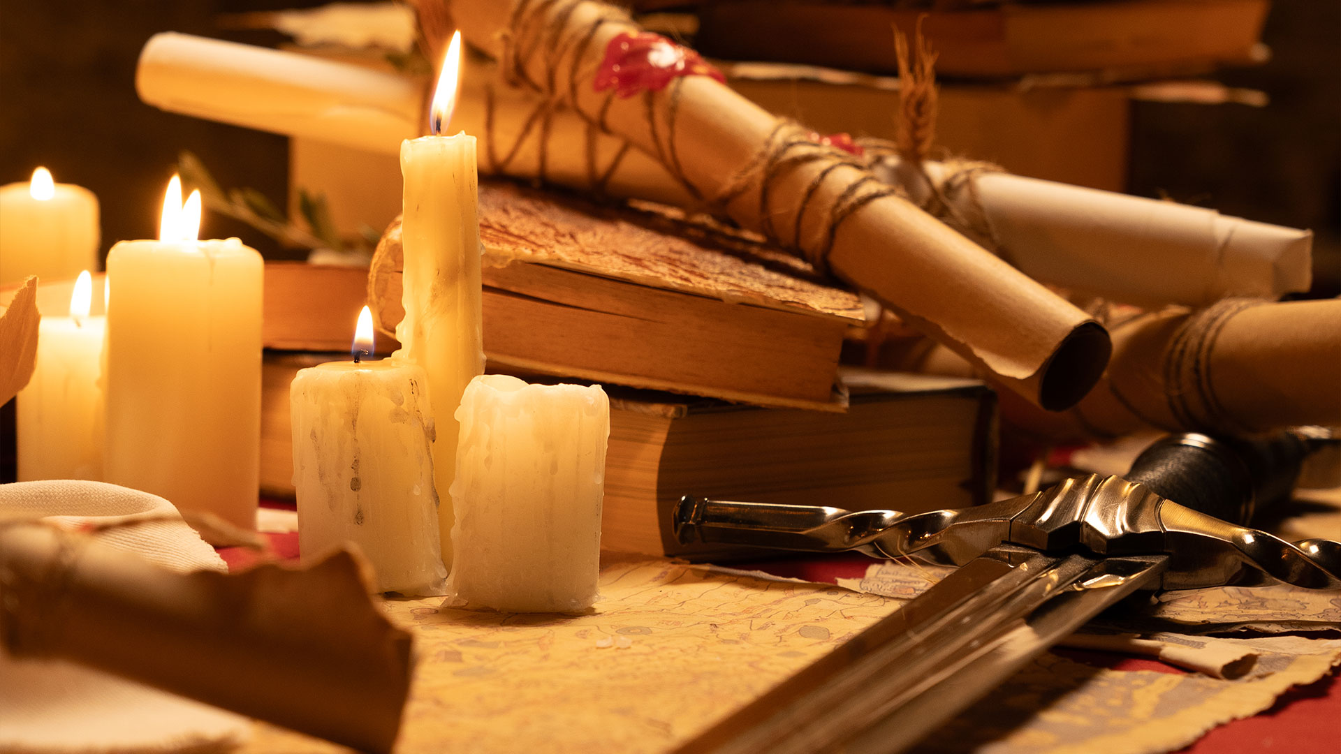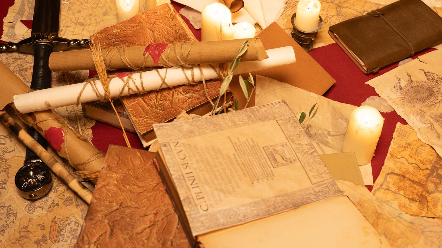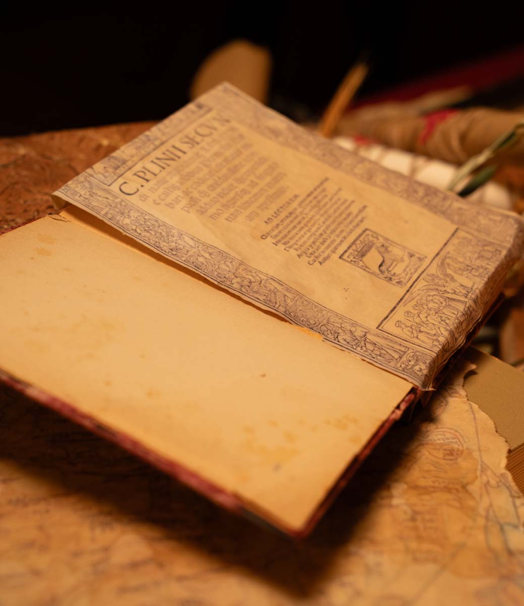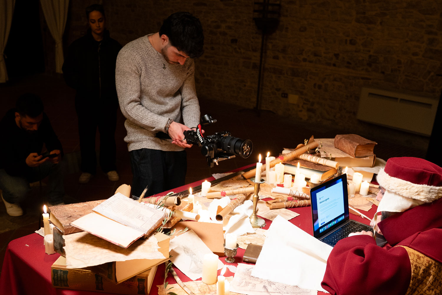 Ogni oggetto presente nell’ambiente medievale è selezionato per costruire un linguaggio coerente: pergamene, mappe, materiali naturali, texture del legno. La scenografia è stata curata nel minimo dettaglio e supportata da un esperto medievista per garantire autenticità rispetto all’epoca che vogliamo ricostruire.