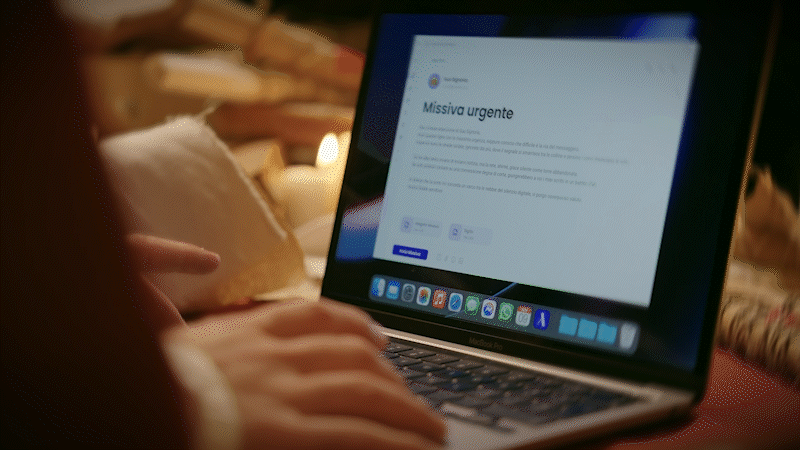 Il laptop è l’unico corpo estraneo, pensato come punto di frattura visiva. La sua presenza rompe la continuità del mondo antico e introduce il primo segnale di dissonanza che porta al twist.