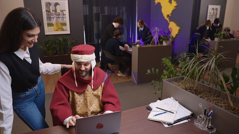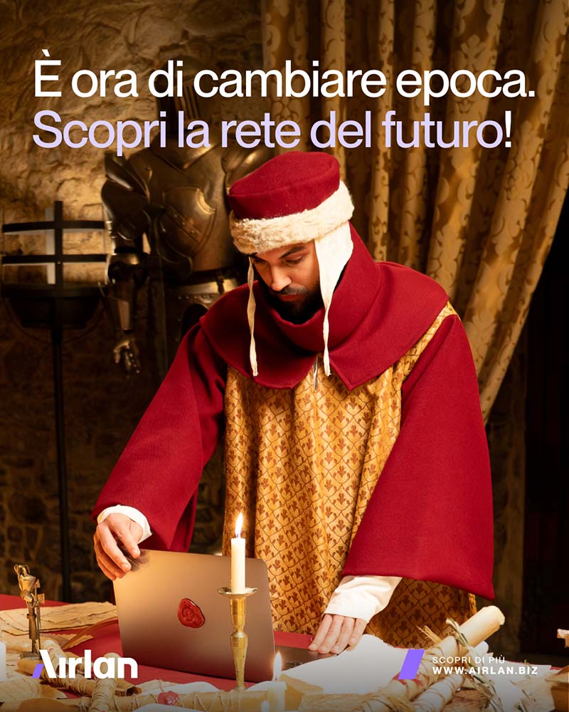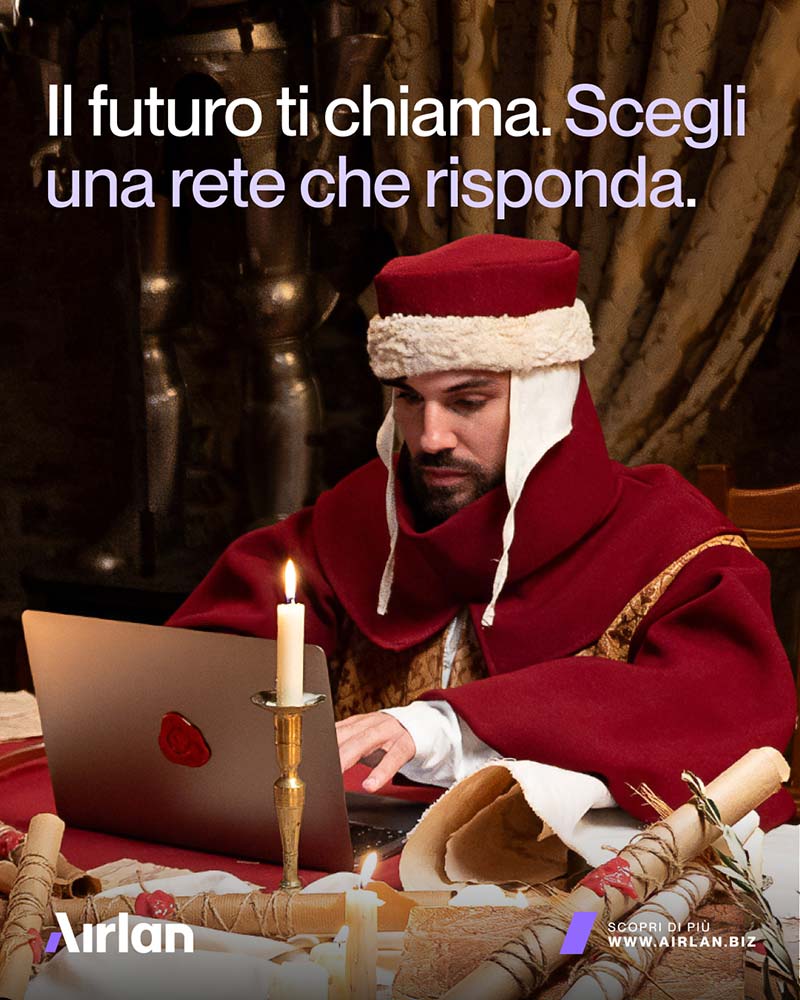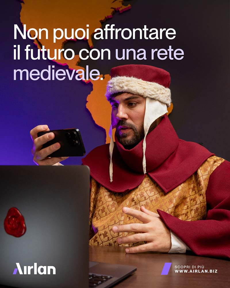 La rivelazione avviene con un passaggio netto al presente. L’uomo, ancora in abiti medievali, appare in un ufficio contemporaneo, circondato da colleghi che lo osservano come si osserva un anacronismo. Qui il tono cambia: la tensione epica lascia spazio a un’ironia diretta, immediata, che traduce il concept nella sua forma più chiara. La chiusura brand consolida il messaggio: Airlan è la rete che ti riporta nel presente. Un finale rapido, pulito, costruito per lasciare un’immagine forte e un claim riconoscibile.