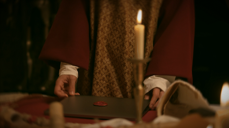 Tutto contribuisce a un’estetica credibile, coerente con il tono epico dell’apertura. Ogni oggetto è collocato per suggerire gravitas e ritualità, elementi che rafforzano la solennità del gesto del protagonista.