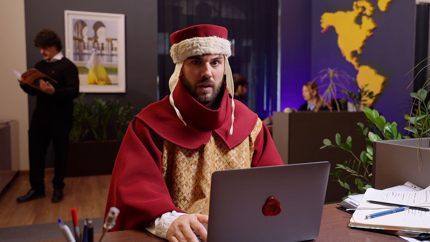 Nell’ufficio moderno, la scenografia lavora in direzione opposta: crea un contesto ordinario, riconoscibile, che restituisce immediatezza e quotidianità. La pulizia visiva e gli oggetti funzionali alla vita lavorativa contemporanea definiscono uno spazio che amplifica l’anacronismo del protagonista. La scenografia diventa quindi uno strumento narrativo attivo: crea il terreno su cui il personaggio medievale appare, inevitabilmente, fuori tempo.