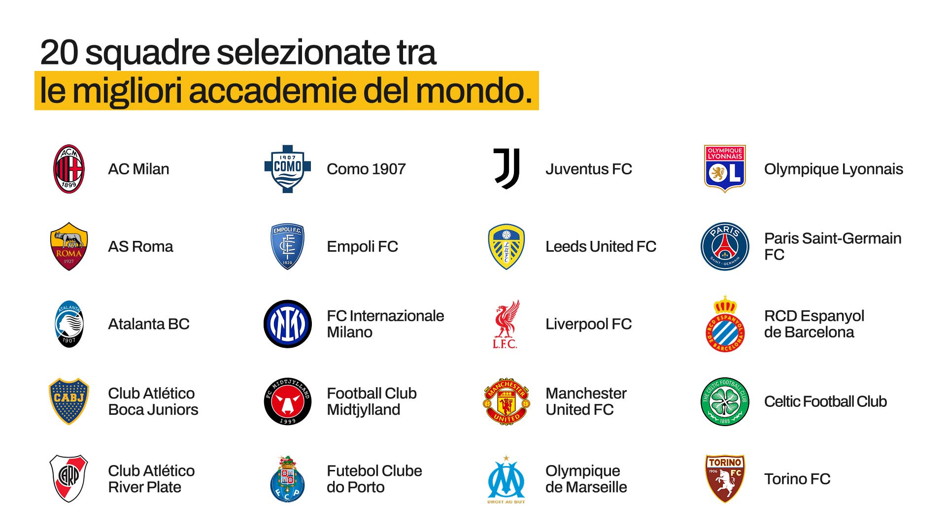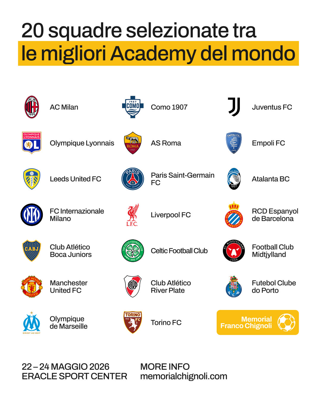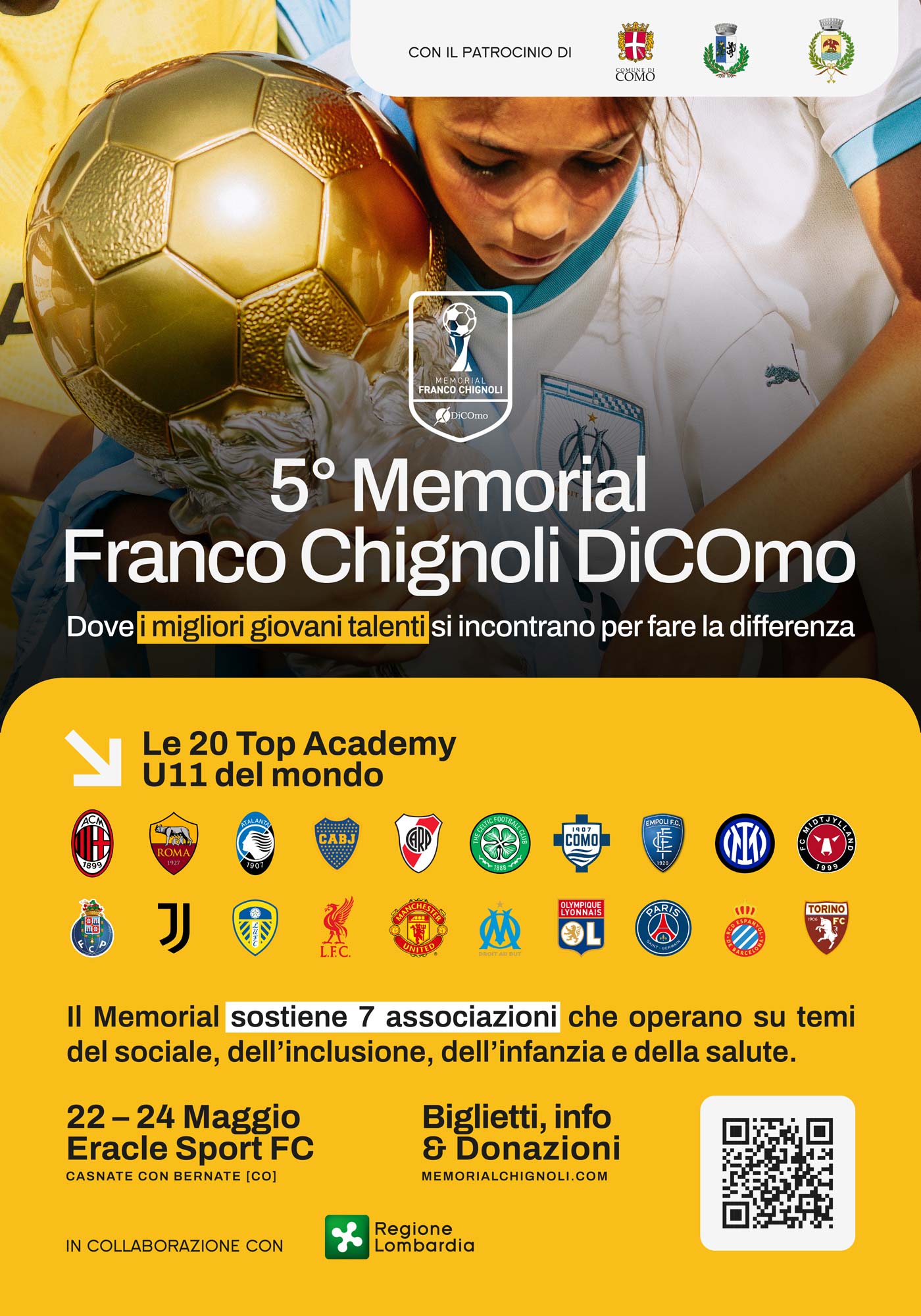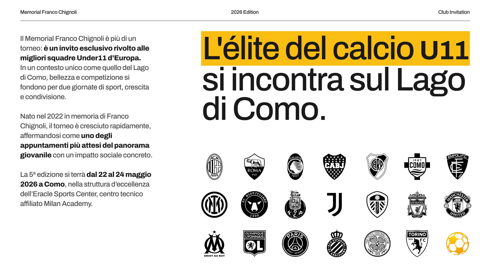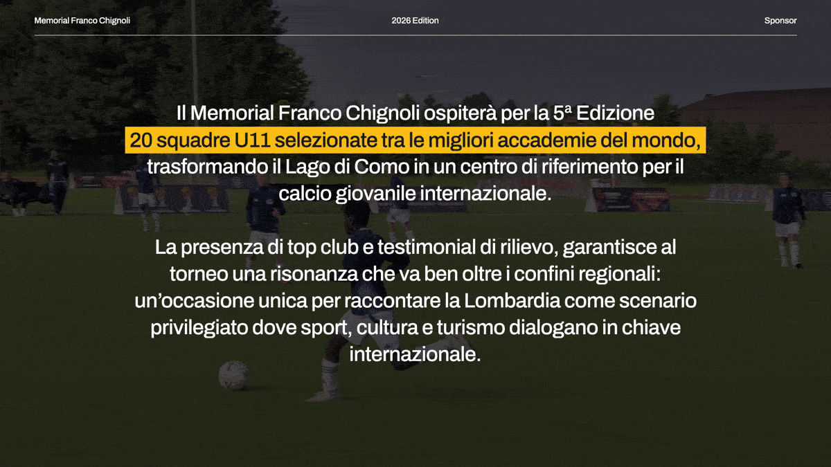 Il Memorial riunisce 20 Academy selezionate tra le migliori al mondo e porta sul Lago di Como un ecosistema che coinvolge club, famiglie, partner, ambassador e stakeholder istituzionali, mettendo in relazione calcio giovanile d’élite, charity, territorio e CSR, trasformando l’evento in una piattaforma culturale e mediatica con una forte identità.